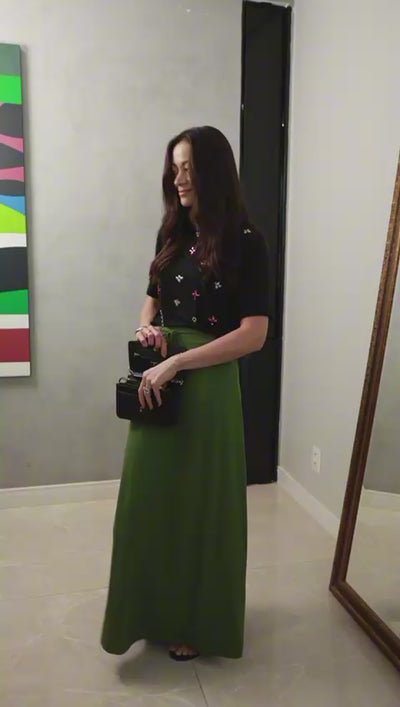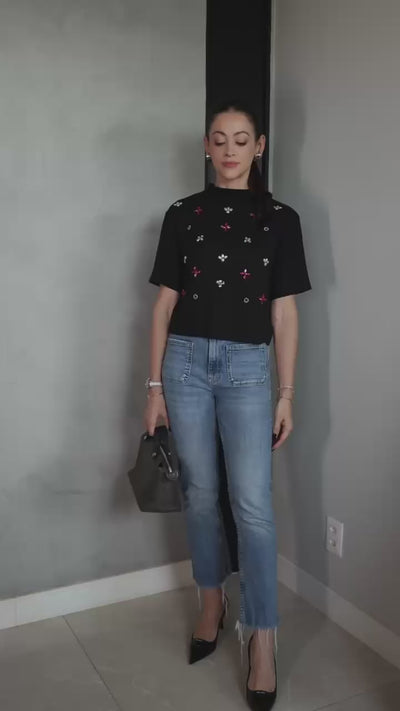 Blusa em malha 96% viscose e 4% elastano. Mangas largas e gola em ribana. Bordada à mão.