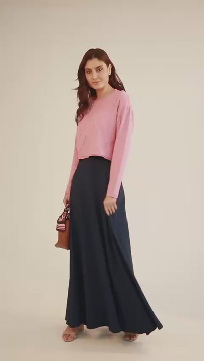 Blusa moletom manga longa, acabamento à fio, bordada à mão em vidrilhos.