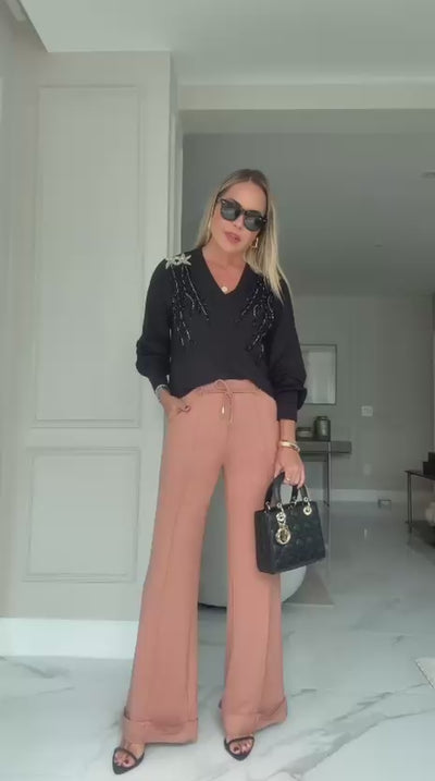 Calça modelagem flaire, cós com elástico, possui detalhe em nervura frontal, barra dobrada, passante e ponteiras. Confeccionada em moletinho 97% viscose e 3% elastano.