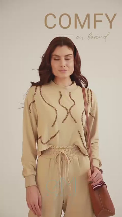 Conjunto em moletinho. Calça reta com cós de elástico e blusa com acabamento em ribana e bordada à mão com vidrilhos.