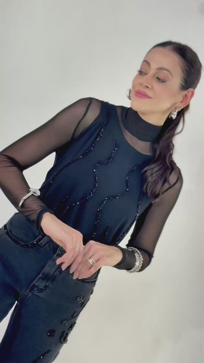 Blusa regata, malha viscose com elastano, bordada à mão em vidrilhos. Modelagem solta com cava do braço larguinha.