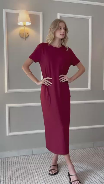 Vestido básico em moletinho com bolso, modelagem reta com fenda atrás.
