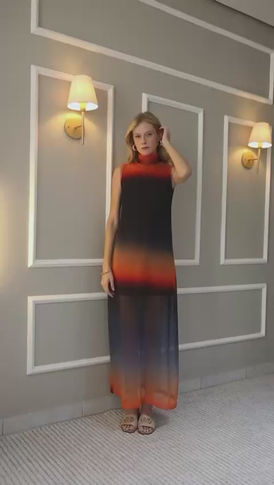 Vestido em tule degradê, fluido e leve como o fim de tarde. O movimento das cores reflete a calma e o brilho do sol que se despede.